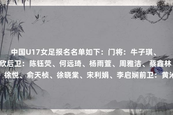 中国U17女足报名名单如下:门将:牛子琪、 李欣芝、尤雅欣后卫:陈钰荧、何远琦、杨雨萱、周雅洁、蔡鑫林、中场:宋语、陈睿琳、徐悦、俞天桢、徐晓棠、宋利娟、李启娴前卫:黄沁怡、周欣怡、陈俊吉、曾屹婕、张克璨、方珍珠 欧洲杯足球体育信息