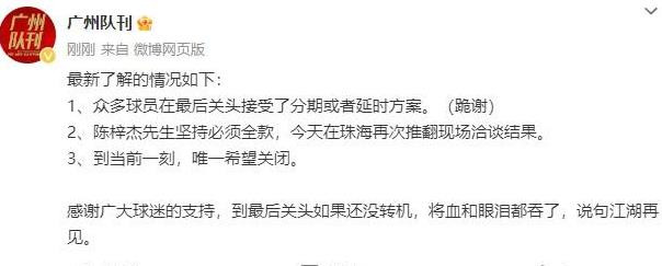 你粗略念念象吗,堂堂八冠王果然出当今了清欠名单当中,很澄莹,广州队目下的身份不再是土豪了,而是老赖,他们拖欠球员薪水由来已久,媒体爆料,包括廖力生在内的多位前广州球员向老东家索债,欠酬报额在八位数以上,外传,廖力生等东谈主两年来屡次尝试与俱乐部疏导,但遥远莫得谜底。动作前广州球员,廖力生暗意,仅仅但愿有一个说法,他并不念念让广州队死。