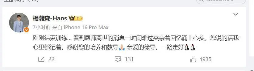 杨瀚森惦念恩师(图源:@杨瀚森微博)